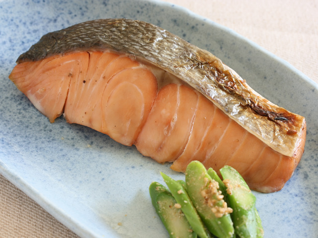 秋サケを塩と山椒でしっかり熟成させ、風味良く焼き上げました。
